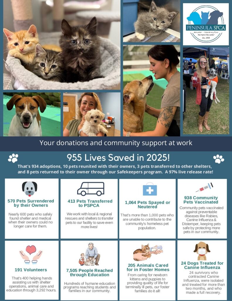The mission of the Peninsula SPCA is to find loving homes for every animal in our care, and to advocate for the humane treatment of all animals in our community.