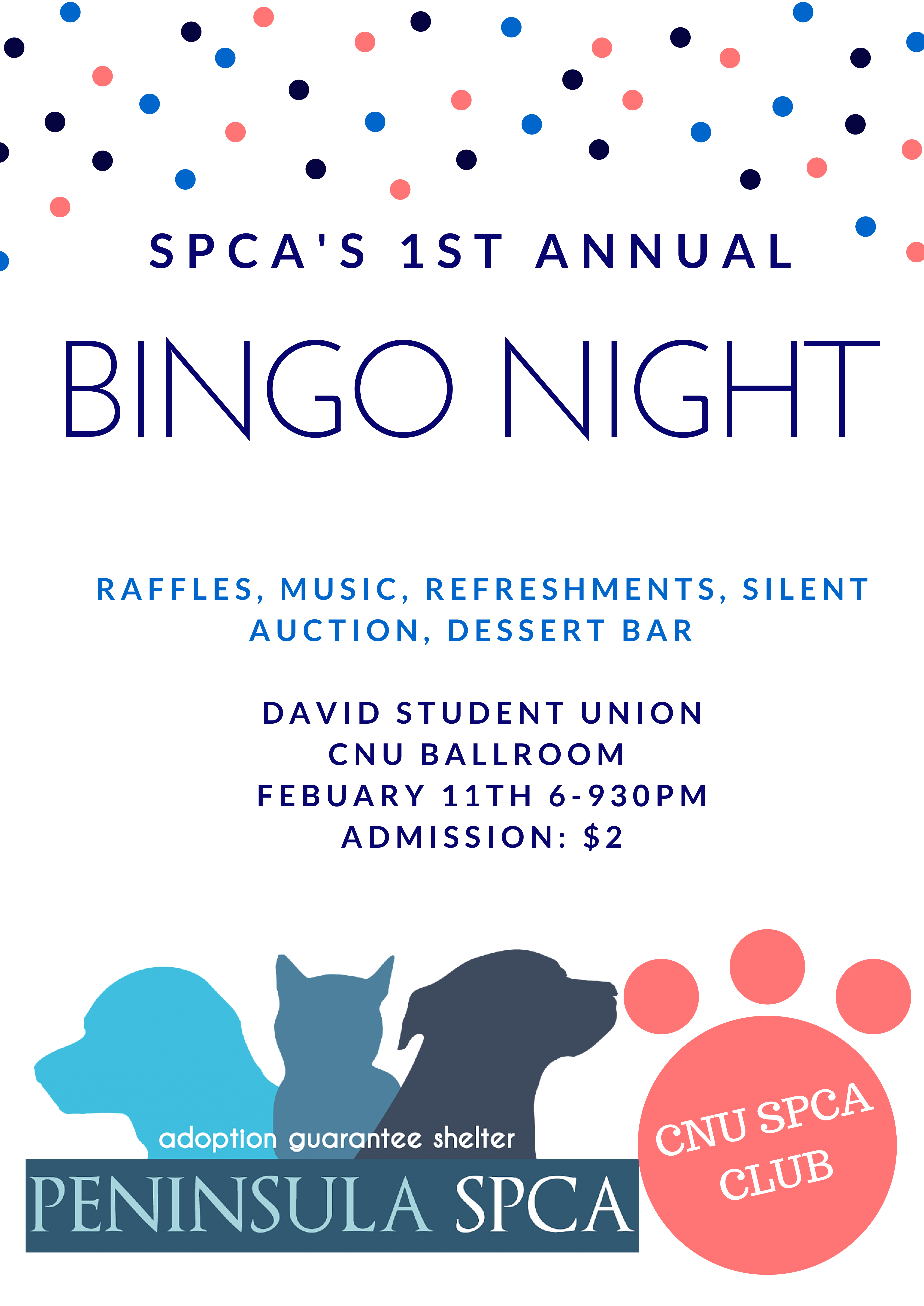 Join us at Christopher Newport University for a fun night of Bingo and great prizes! Brought to you by CNU’s Peninsula SPCA Club. Open to the Public! Details to come!