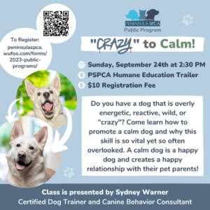 Come learn how to promote a calm dog and why this skill is so vital, yet so often overlooked. A calm dog is a happy dog and creates a happy relationship with their pet parents! Presented by Sydney Warner, Certified Dog Trainer and Canine Behavior Consultant.