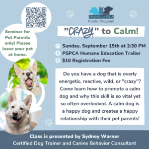 Register here: Crazy to Calm – PSPCA Seminar – Clever Critters, LLC (clever-critters.com)