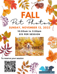 Fall is a magical time of year. Get in the Fall spirit will Fall Pet Photos! Photo sessions will have lots of fun props for your pet and will be held at the Peninsula SPCA on Sunday, November 12th from 10am-3:00pm. Each session is available for a $15 donation and all photos will be emailed to you after the event.