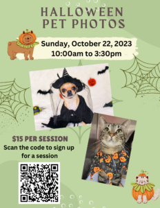 $15.00Get ready with your cutest costumes for this pet-tacular photo session! Photo sessions with lots of fun props for your pet will be held at the Peninsula SPCA on Sunday, Oct. 22nd from 10am-3:30pm. Each session is available for a $15 donation and all photos will be emailed to you after the event.
