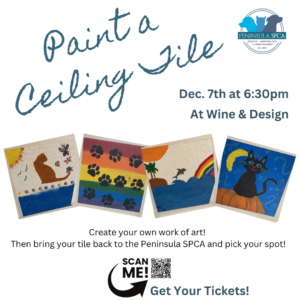 $20.00Paint a ceiling tile to decorate our shelter! This is a free-paint opportunity to draw your own design. Starts at 6:30pm. Guests are invited back to the shelter starting the following day to pick the location for their ceiling tile. Half of the proceeds from ticket sales will also be donated to the Peninsula SPCA!