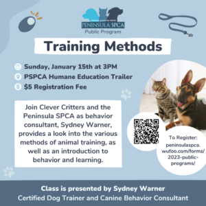 Join Clever Critters at the Peninsula SPCA as behavior consultant, Sydney Warner, provides a look into the various methods of animal training while also providing an introduction to animal behavior and learning. We’ll discuss the pros and cons of different approaches and review what updated research promotes as science-backed methods today. With access to the internet and reality TV, there is an enormous amount of misleading and even unethical advice. By the end of our discussion, we hope you’ll feel more knowledgeable about how to choose a professional to work with you and your pet as well as how to improve the human-animal bond with your pets at home!